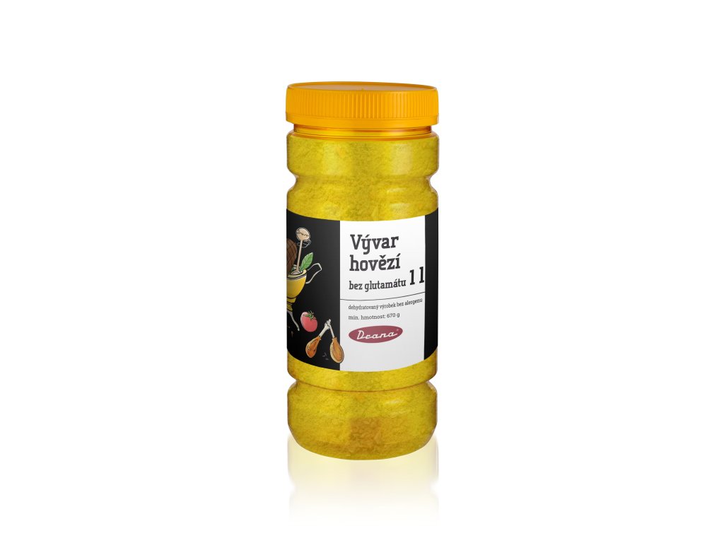 Složení: jedlá sůl 40%, kvasnicové extrakty, rostlinný palm. tuk, cibule, maltodextrin, cukr, dextróza (monohydrát), pastiňák, karotka, petržel, pepř černý, nové koření, bobkový list, extrakt hovězí maso, přírodní aroma. Příprava: rozmícháme ve vroucí vodě a 5min povaříme.